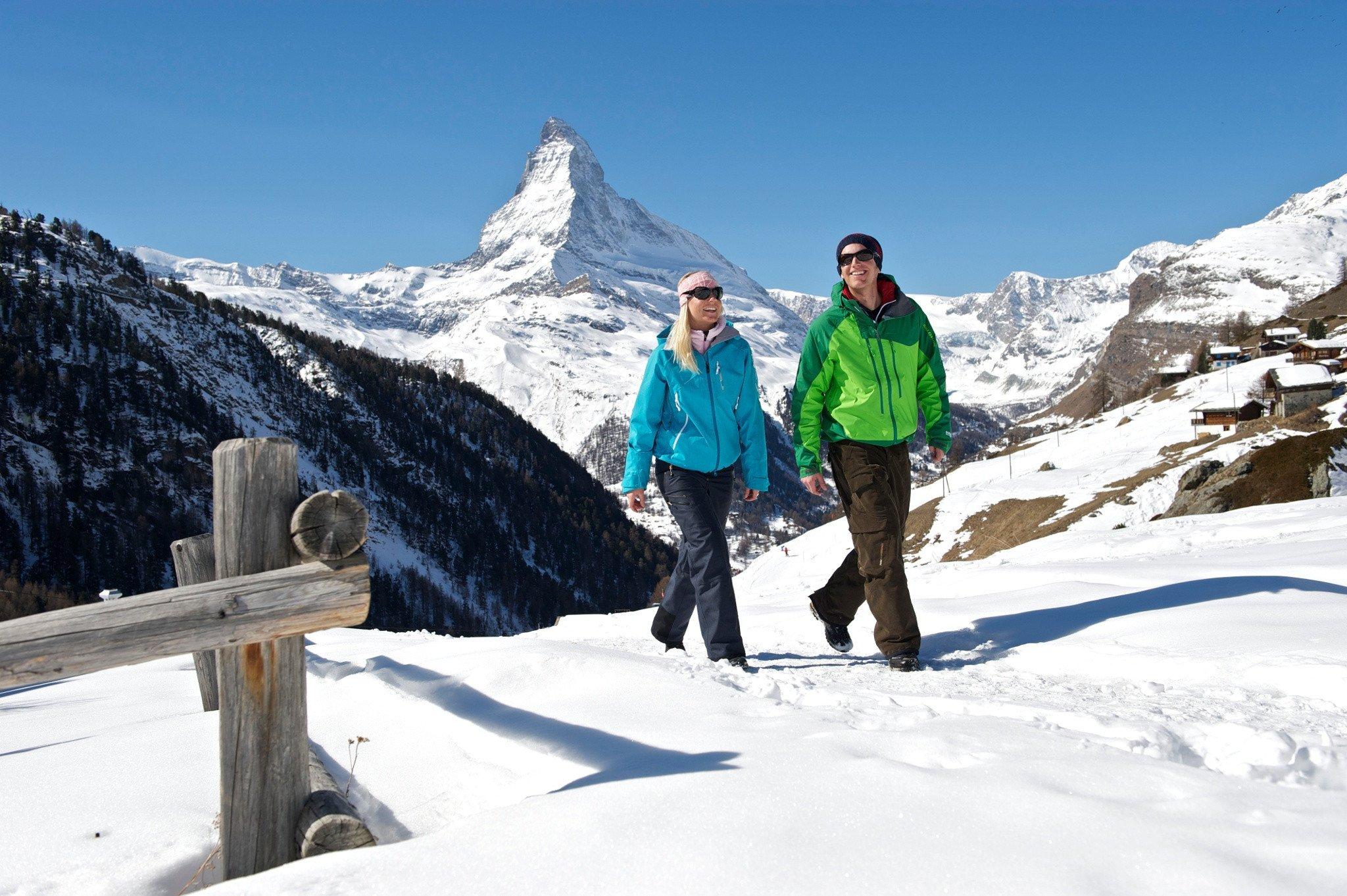 Zermatt-Sunnegga (via Winkelmatten) (Nr. 112)Diese Zermatter Winterwanderung bietet alles, was einen Wintertraum ausmacht: Sonne, Waldromantik, Schneeberge, kulinarischen Genuss und eine atemberaubende Aussicht.