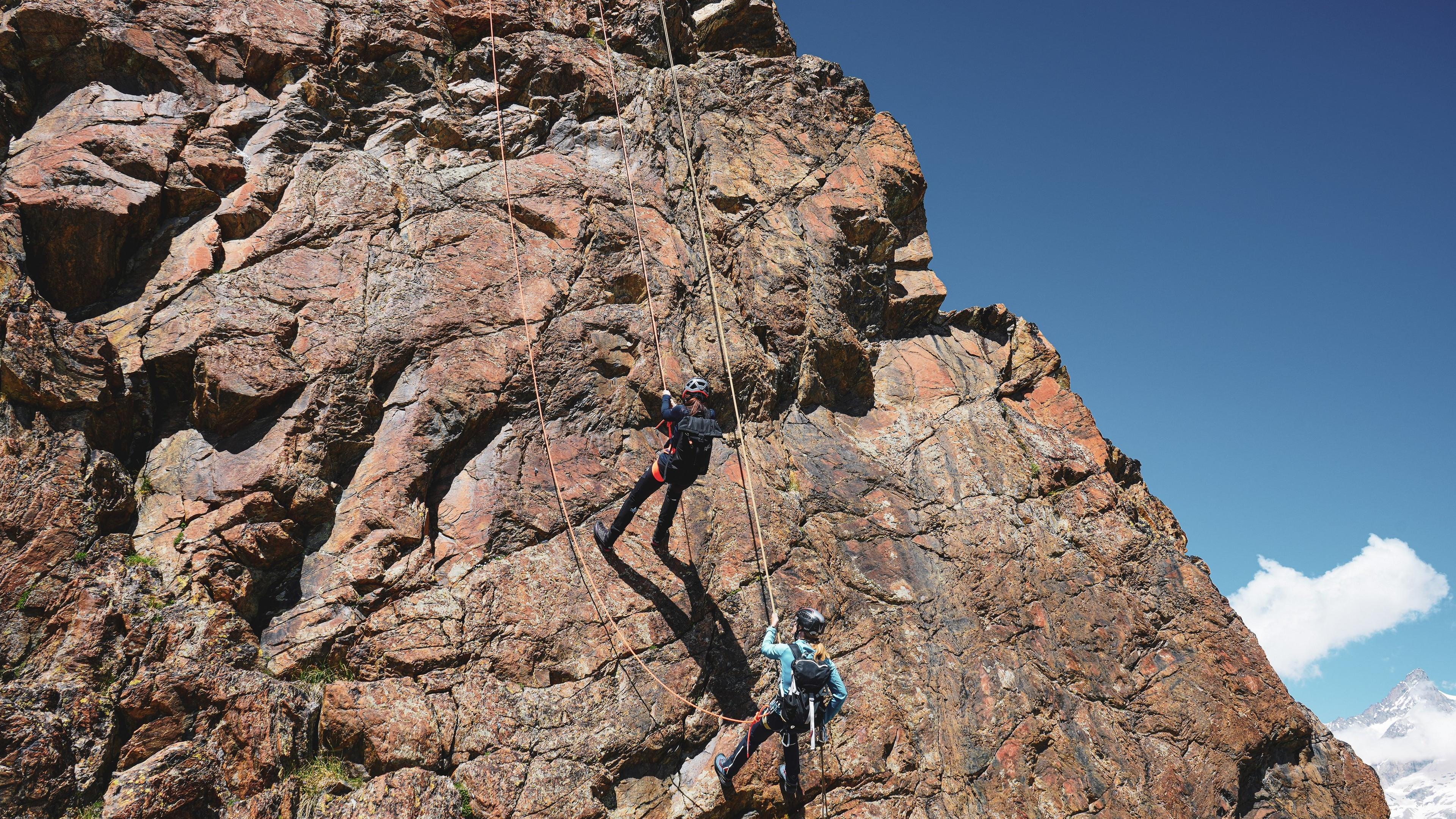 Alongside the big, well-known high-altitude routes, you can also spend more leisurely days on the rock face in Zermatt – Matterhorn. Spectacular views included! You can access easier options in the centre of the village or at the Fluhalp. There are also numerous multi-pitch routes on the Riffelhorn, including some that are even suitable with hiking shoes. Climbers often tackle these in preparation for the Matterhorn. There are several walls in the Dossen climbing area. Apart from the ‘Mischisand’ sector, the routes in this climbing area are mainly in the seventh and eighth levels of difficulty.