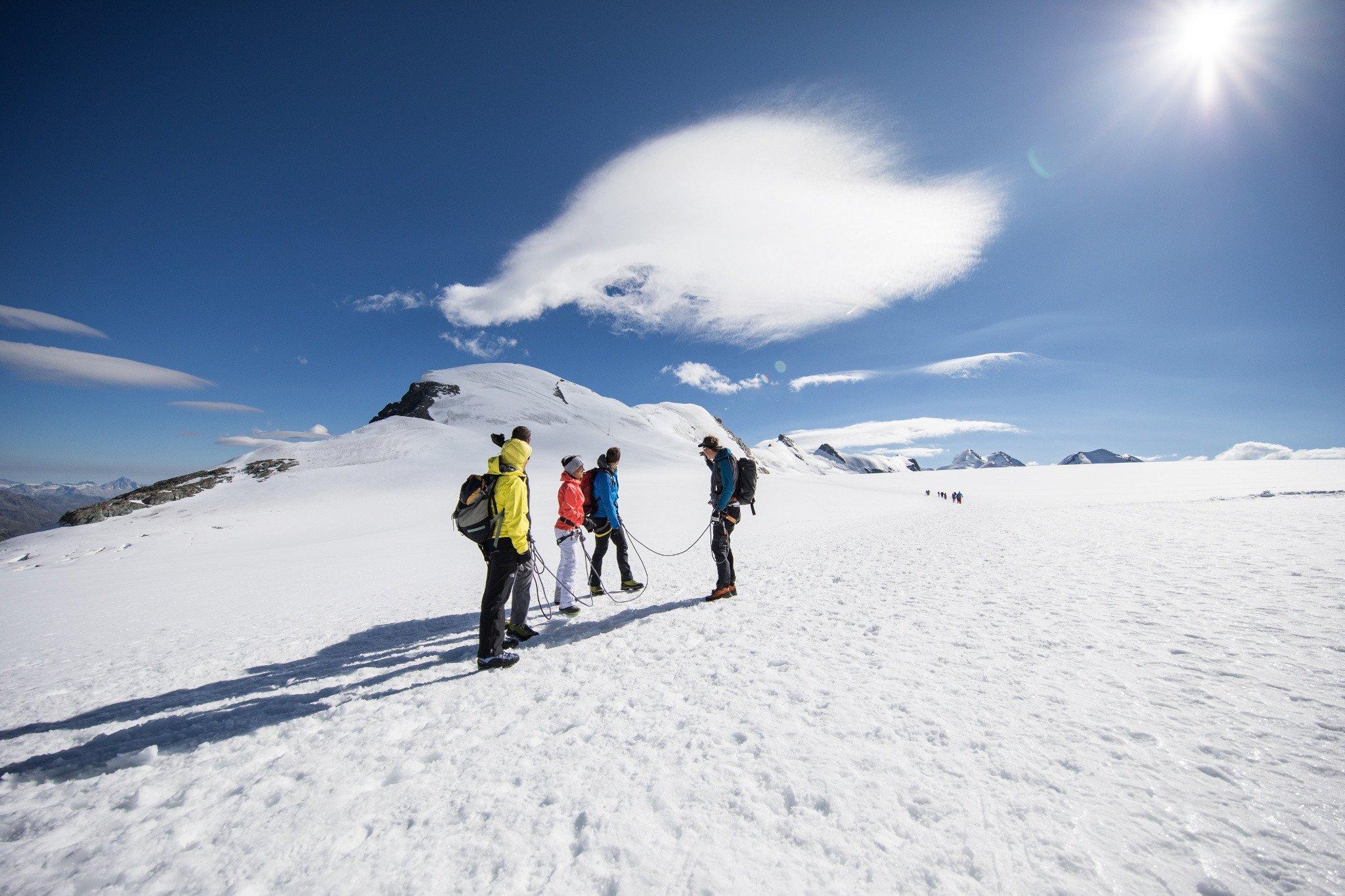This route is ideal for first-time high alpine experience, but only for experienced and sure-footed mountain hikers accompanied by a mountain guide. It involves climbing a glaciated four-thousander, which should not be underestimated. Early in the morning, you take the cable car to the Matterhorn Glacier Paradise at 3,883 m. The ascent and descent on snow and ice takes about three hours, depending on fitness. The climb is not dizzying, but the route offers a high alpine mountain experience where you can enjoy the feeling of having your head already in space.