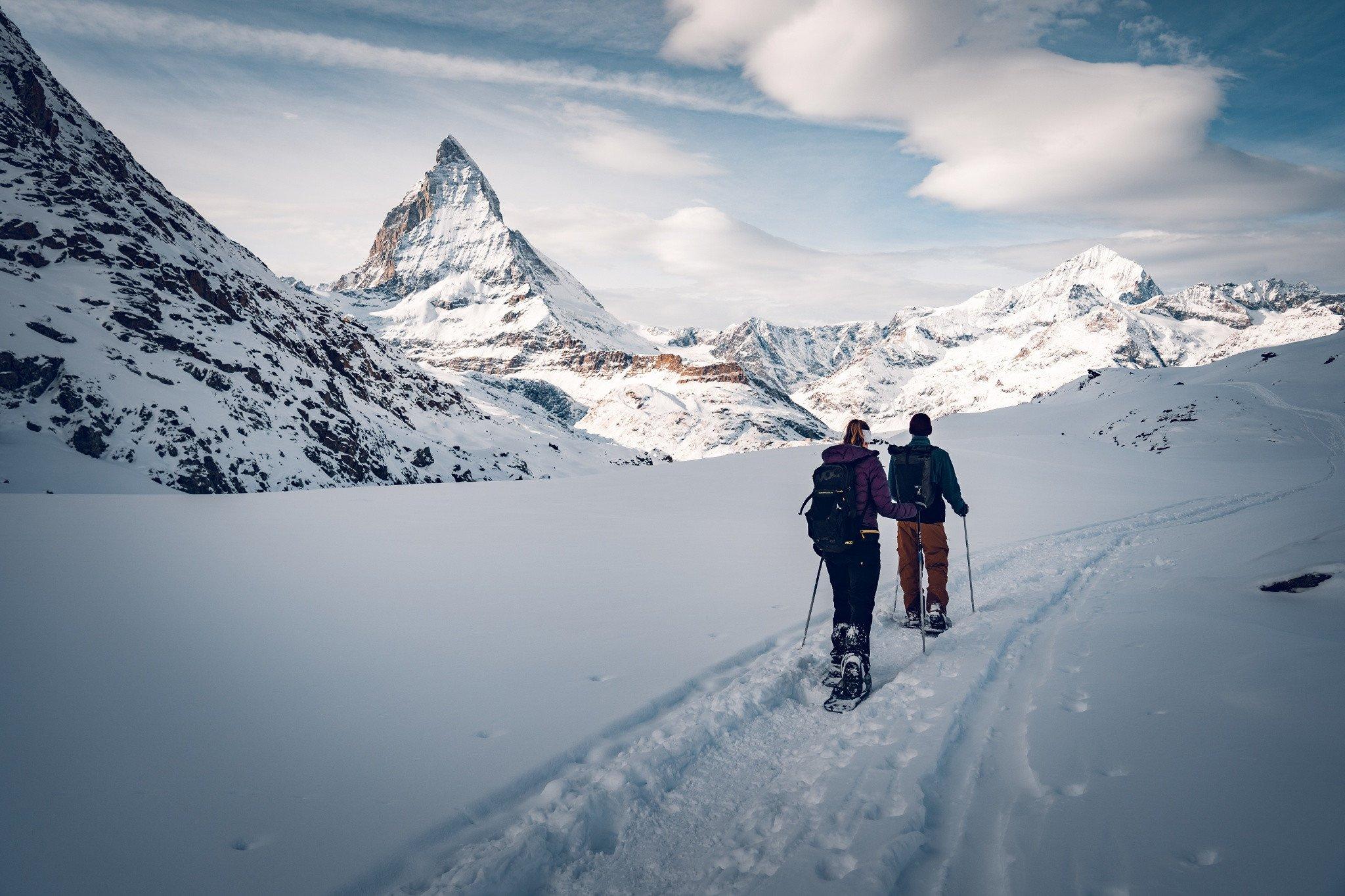 This snowshoe trail runs almost exactly along the Gornergrat railway line from Gornergrat down to Rotenboden. Gleaming snow, sun, and the mountain panorama with the Matterhorn characterize this path.