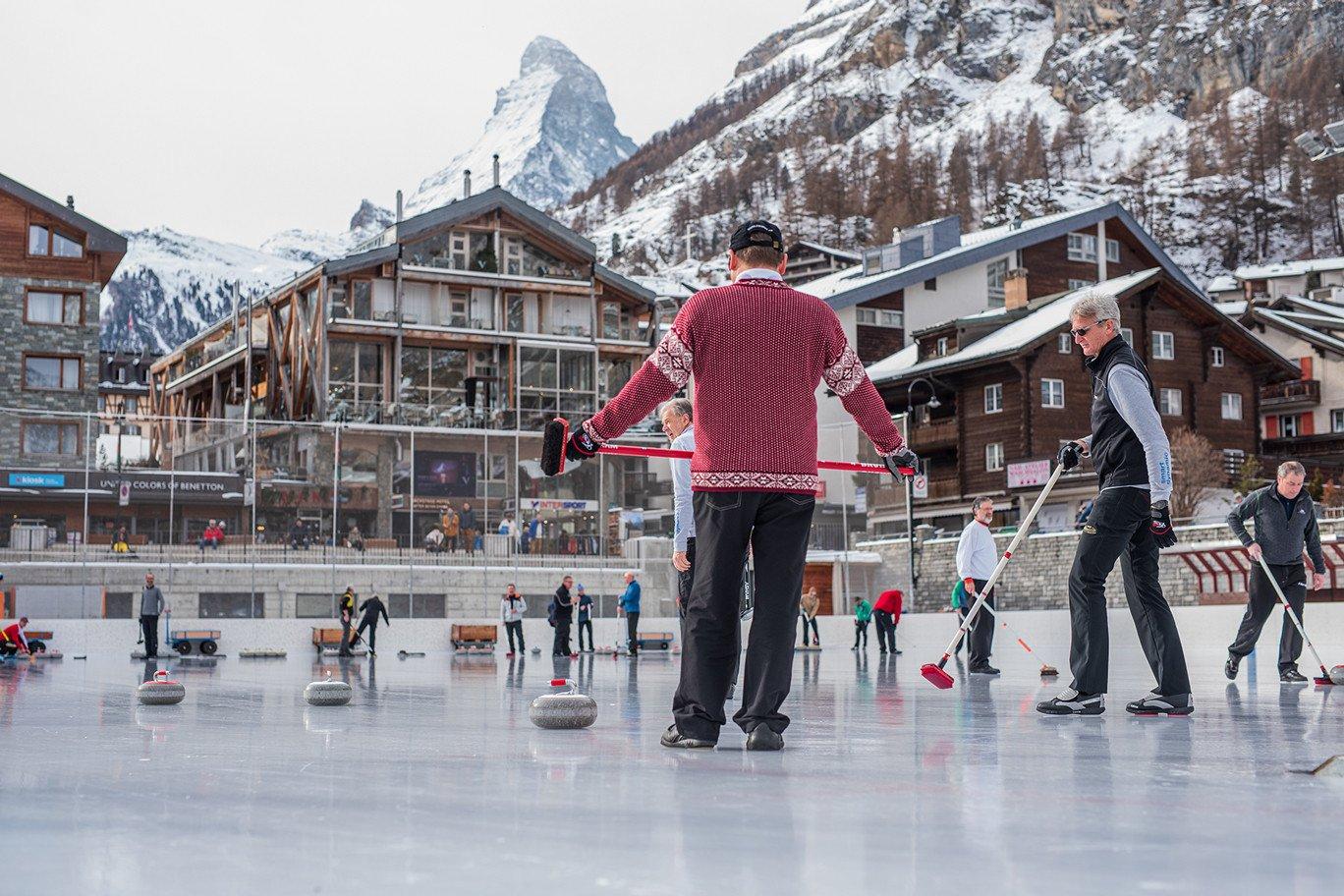 Not to worry: No one needs to bring the curling gear as was the case with the Scottish guests back in the 1920s. They schlepped their granite stones in their luggage so that they did not have to do without their curling fun before the backdrop of the Matterhorn.