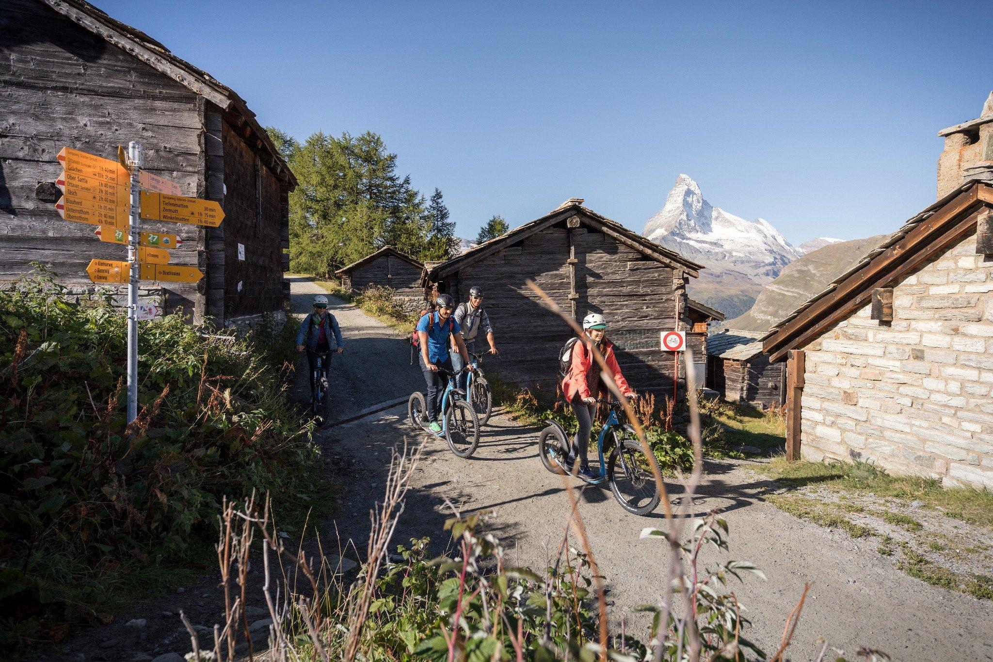 Kickbike riding is the rapid fun for young and old. From Sunnegga it first goes towards Tufteren, past old larches and tall larches. At Tufteren you finally dive into the green of the mountain forest. In a wide zigzag it goes down into the village of Zermatt.