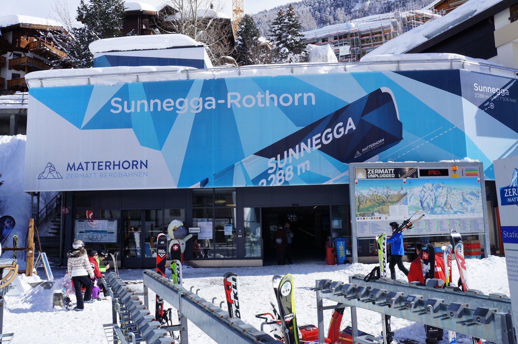 The Sunnegga-Rothorn valley station (1,620 m) lies beside the Vispa, the river that flows through Zermatt. The ticket counter area is located by the entrance of a long tunnel fitted with electronic information panels. Since 1980, a funicular has carried Swiss and foreign guests up to Sunnegga. In former days the area had a walkers’ lift and then a chairlift; the funicular was Switzerland’s first to run entirely underground. The funicular was fully renovated in 2013, and now has a capacity of 2,550 passengers per hour. The ride takes 3 minutes.