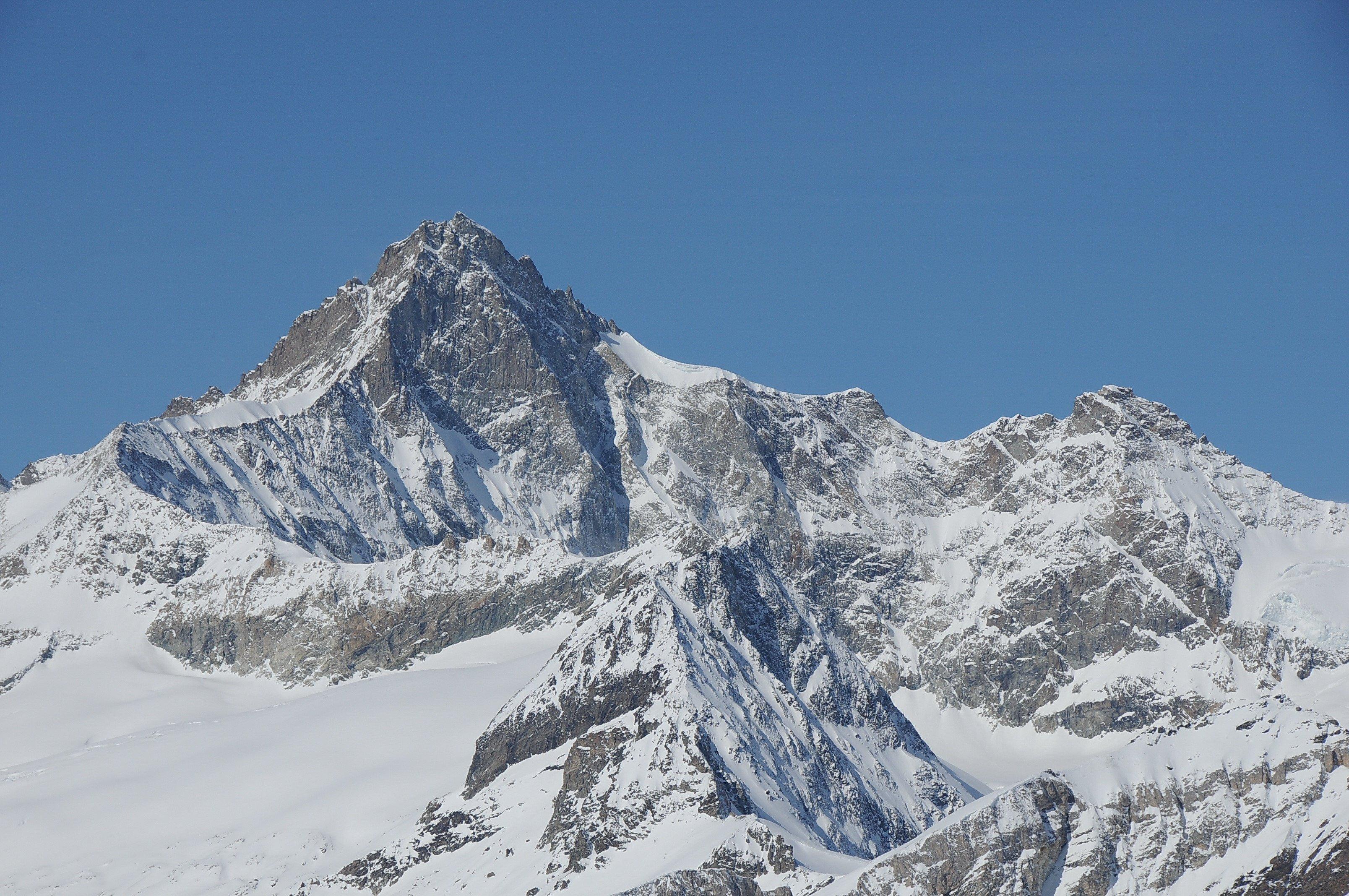 The summit of the Zinalrothorn appears to lean to one side and so is unmistakable. The ascent via the Rothorngrat ridge is regarded as one of the finest rock climbs in the Zermatt region.