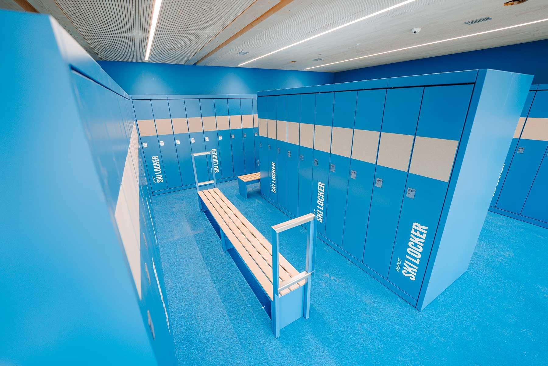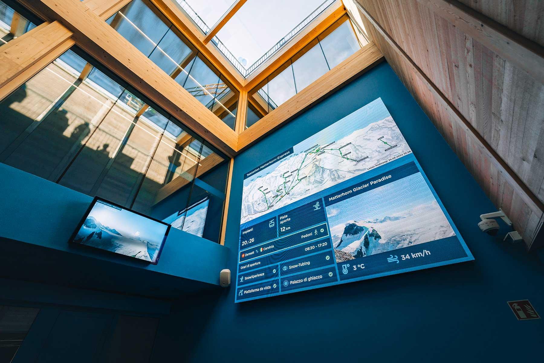 De plus, un grand mur de LED et plusieurs écrans numériques installés dans la zone d’accès aux remontées donnent des informations importantes en temps réel sur le statut des remontées. Le rez-de-chaussée et le premier étage proposent de nouveaux casiers à skis pouvant être utilisés pour y déposer son matériel. Le premier étage dispose également de vastes installations sanitaires.