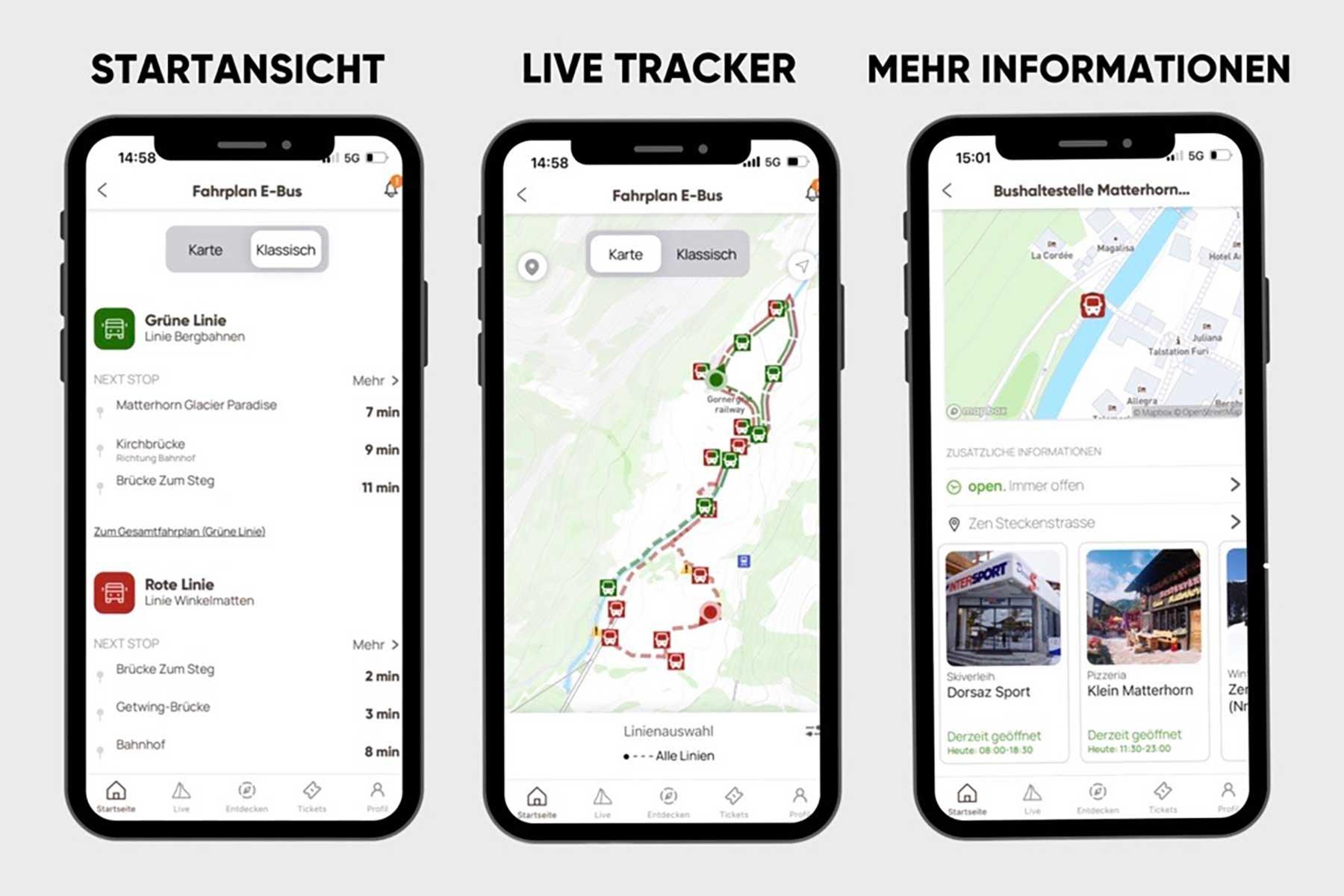 Le projet de numérisation de longue date «Horaires en temps réel des e-bus» a été concrétisé. La carte indiquant l’emplacement des e-bus de Zermatt est disponible depuis le lundi 20 novembre dans l’appli Matterhorn.