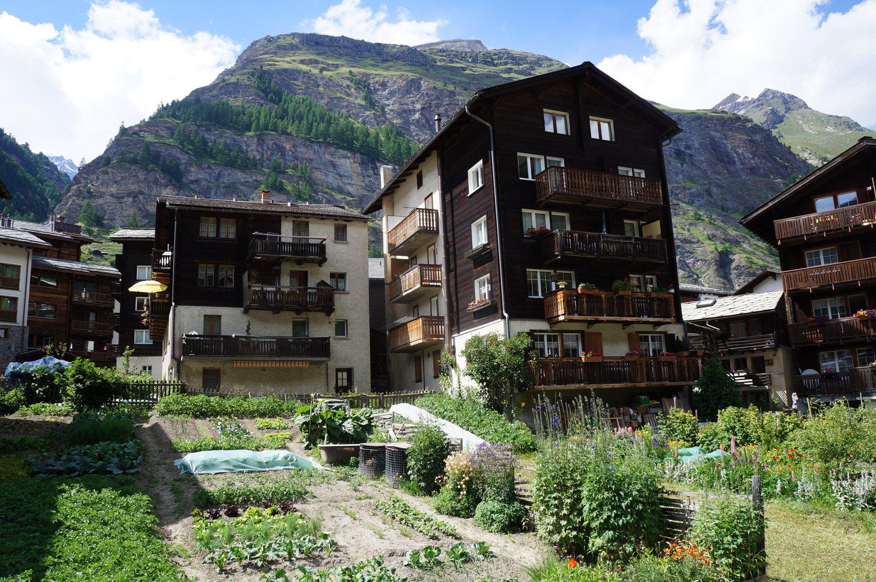 Dans ce quartier, les maisons datent d'époques diverses. Style des Walser, associant pierre et bois, ou style montagnard, avec des constructions en mélèzes. Une grange s'incline fortement sur ses piliers couronnés de grandes pierres plates. Les bâtiments sont joliment parés de fleurs.