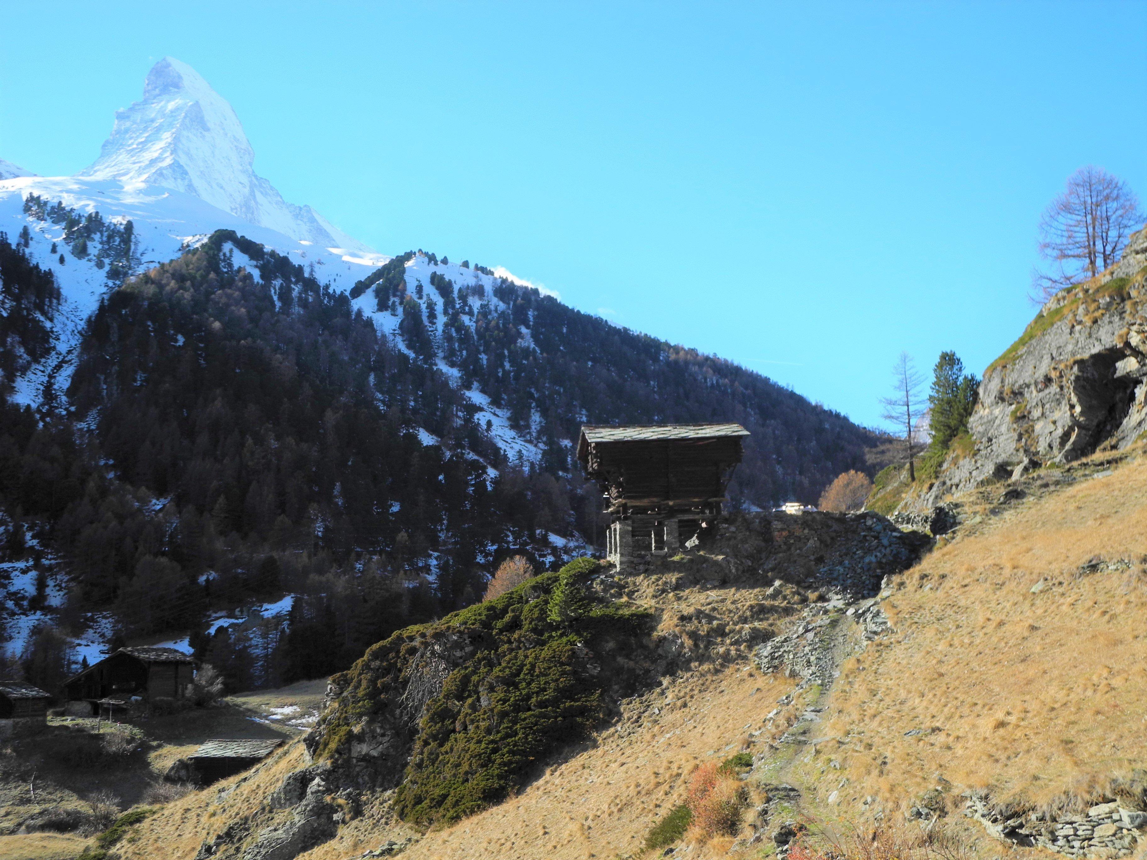 On voit ici l’un des plus beaux greniers de Zermatt construit sur de hauts pilotis avec des dalles en pierre.