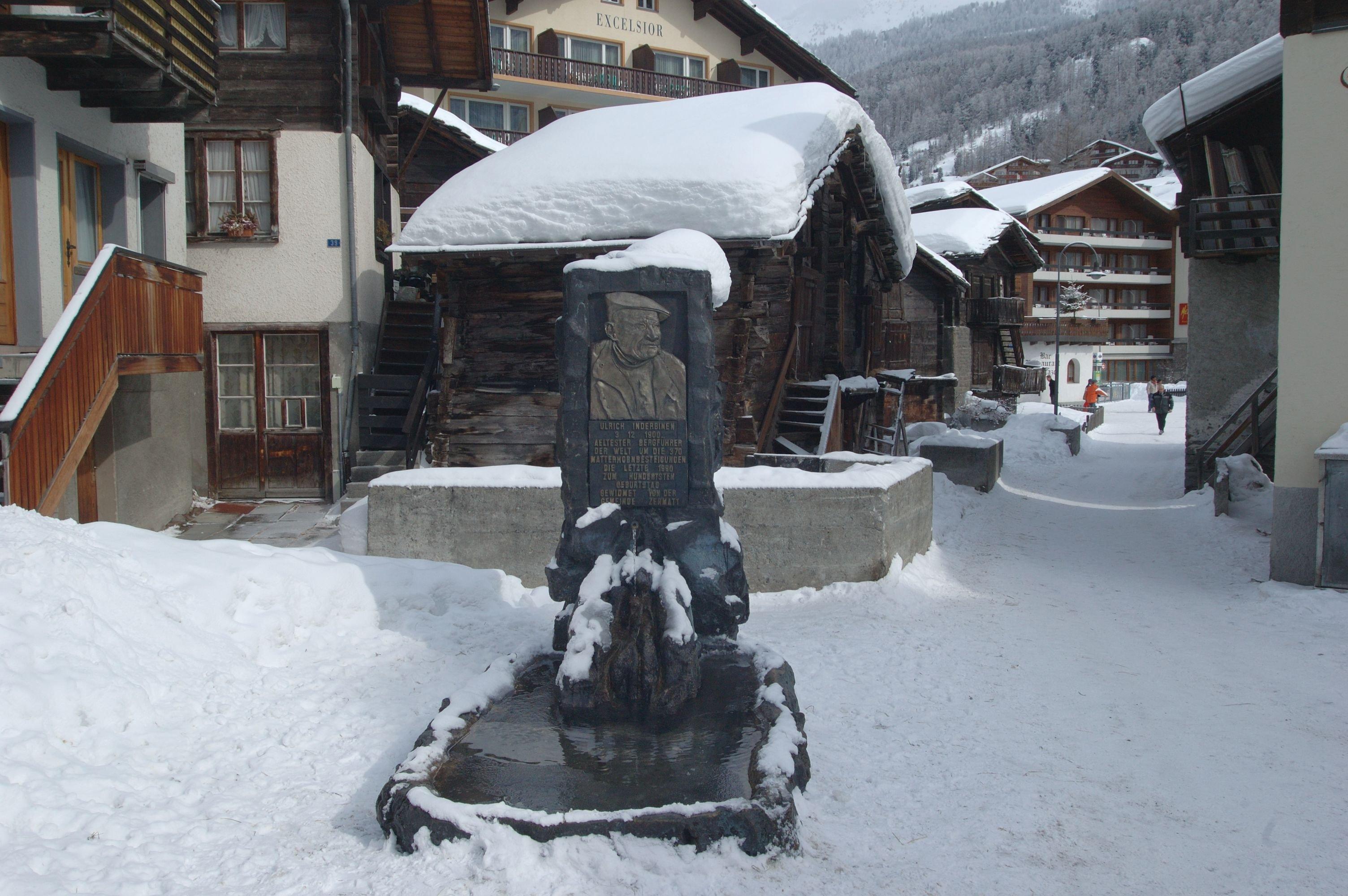 La fontaine Inderbinen fut érigée à l'occasion du 100ème anniversaire du guide Ulrich Inderbinen. Son eau est savoureuse. Le banc de bois qui la flanque invite à la réflexion au sujet de cet habitant légendaire de Zermatt.