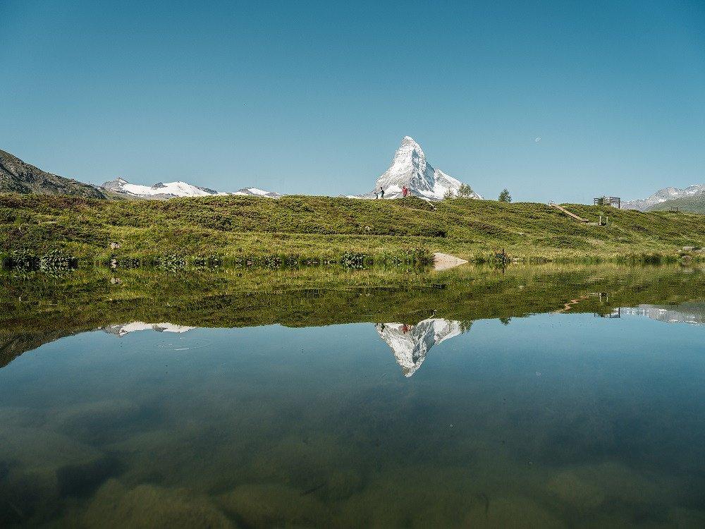 Le lac Leisee (2'232 m) est la plage de Zermatt ainsi qu'une destination d'excursion prisée par toute la famille. Aire de jeux, coins grillade, places de pique-nique, pavillon pour pique-nique et radeau de jeu – sans oublier une vue imprenable sur le Cervin.