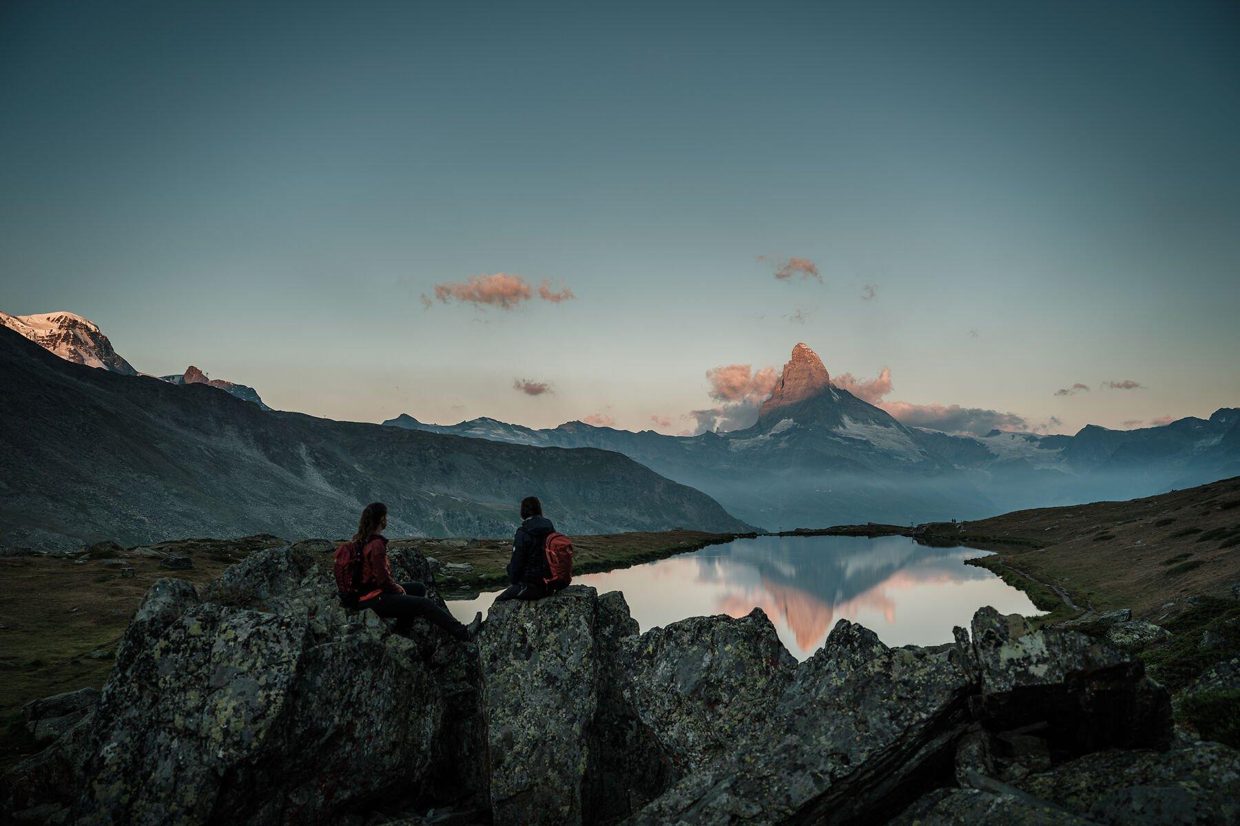 Profite de ce moment magique, lorsque les premiers rayons du soleil viennent plonger le sommet du Cervin dans une chaude lumière. Une randonnée individuelle d’environ 45 minutes mène le long des rives du lac Stellisee vers le restaurant de montagne Fluhalp. Tu y savoureras un petit-déjeuner copieux avec vue sur le panorama impressionnant entourant Zermatt.