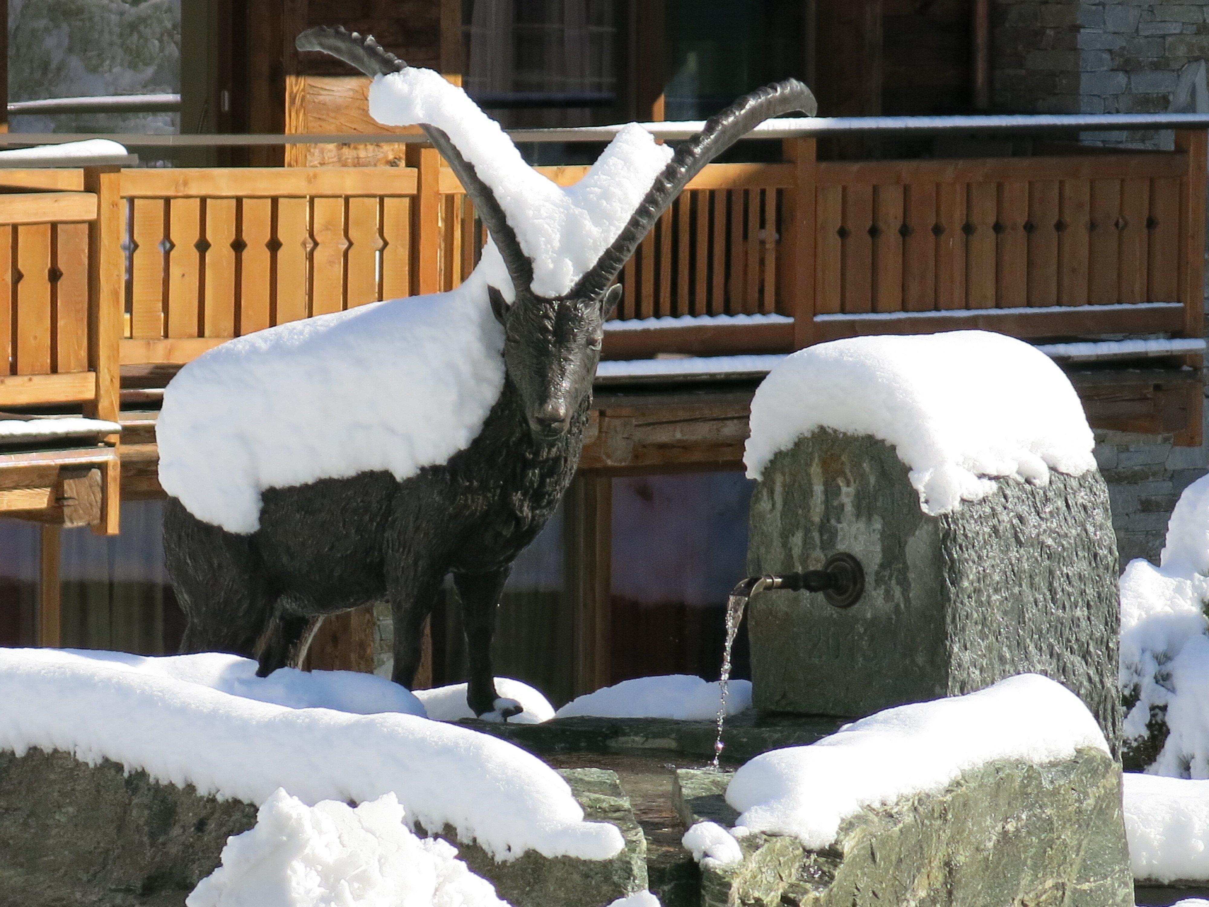 Cette belle fontaine s'inspire d'une histoire vraie. Le splendide bouquetin fut emporté par une avalanche. A partir de son corps, un moule en plâtre a été créé, donnant ensuite naissance à la silhouette de bronze. Harry Lauber, l'hôtelier de l'établissement voisin, le Matterhorn Lodge, reçut même une médaille d'or pour le trophée de ce bouquetin.