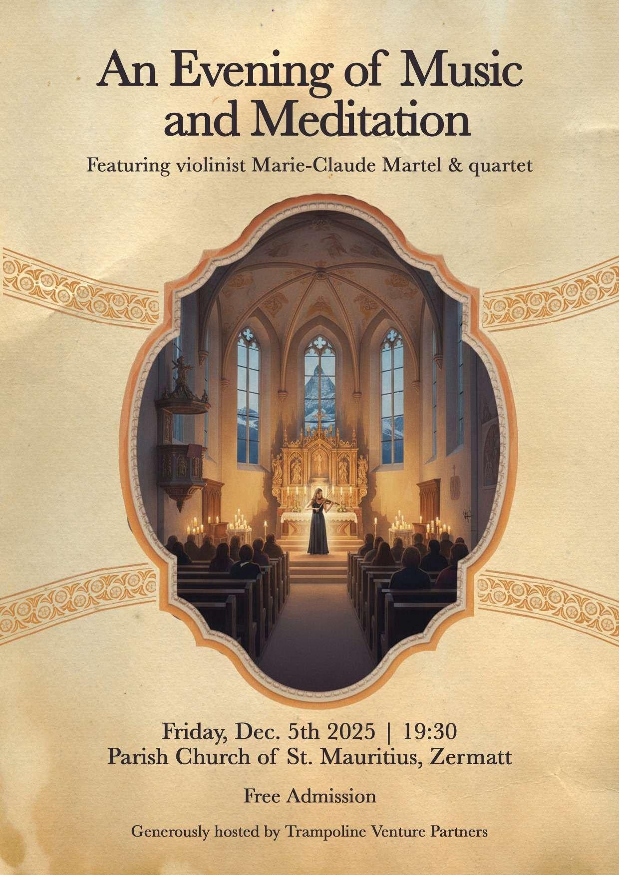 Erleben Sie mit uns einen kostenlosen Abend der Besinnung und des inneren Friedens im Herzen von Zermatt. Klassische Melodien erfüllen den zeitlosen Raum der St.-Mauritius-Kirche und führen uns zu Stille und Dankbarkeit.Dies ist mehr als ein Konzert. Es ist eine Einladung, innezuhalten, tief zuzuhören und durch Musik und Präsenz wieder mit dem inneren Rhythmus in Verbindung zu treten.