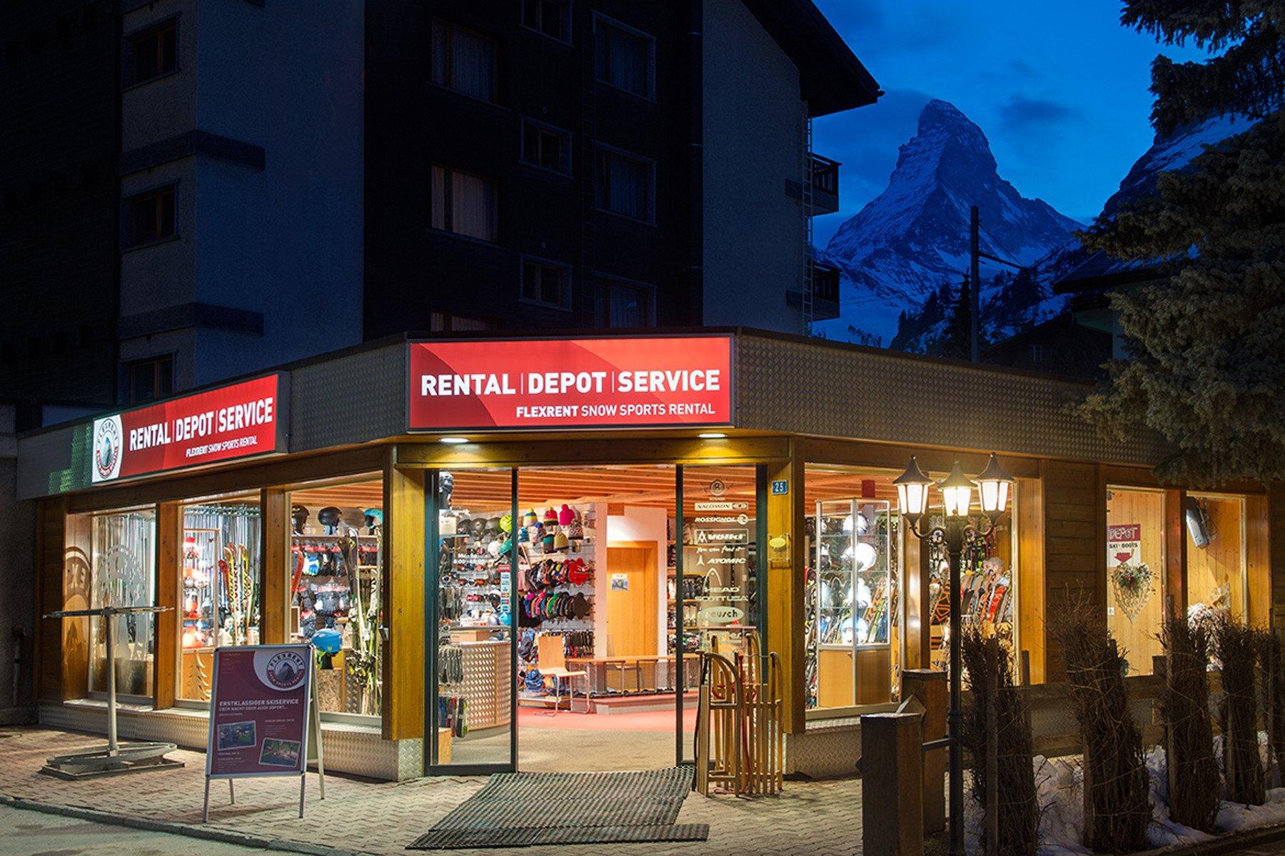 FLEXRENT bietet Verleih von Skiern, Stöcken, Snowboards, Schuhen, Jacken, Hosen, Helmen, Brillen, Handschuhen, Schneeschuhen und Schlitten an – und das mit 20 Jahren Erfahrung. Im Mietpreis inbegriffen ist die Nutzung von zwei Materiallagern, in denen die Schuhe über Nacht trocknen. Das eine befindet sich im Geschäft, das andere auf der anderen Seite des Dorfes, an der Talstation des Klein Matterhorn (Dorsaz Sport).
