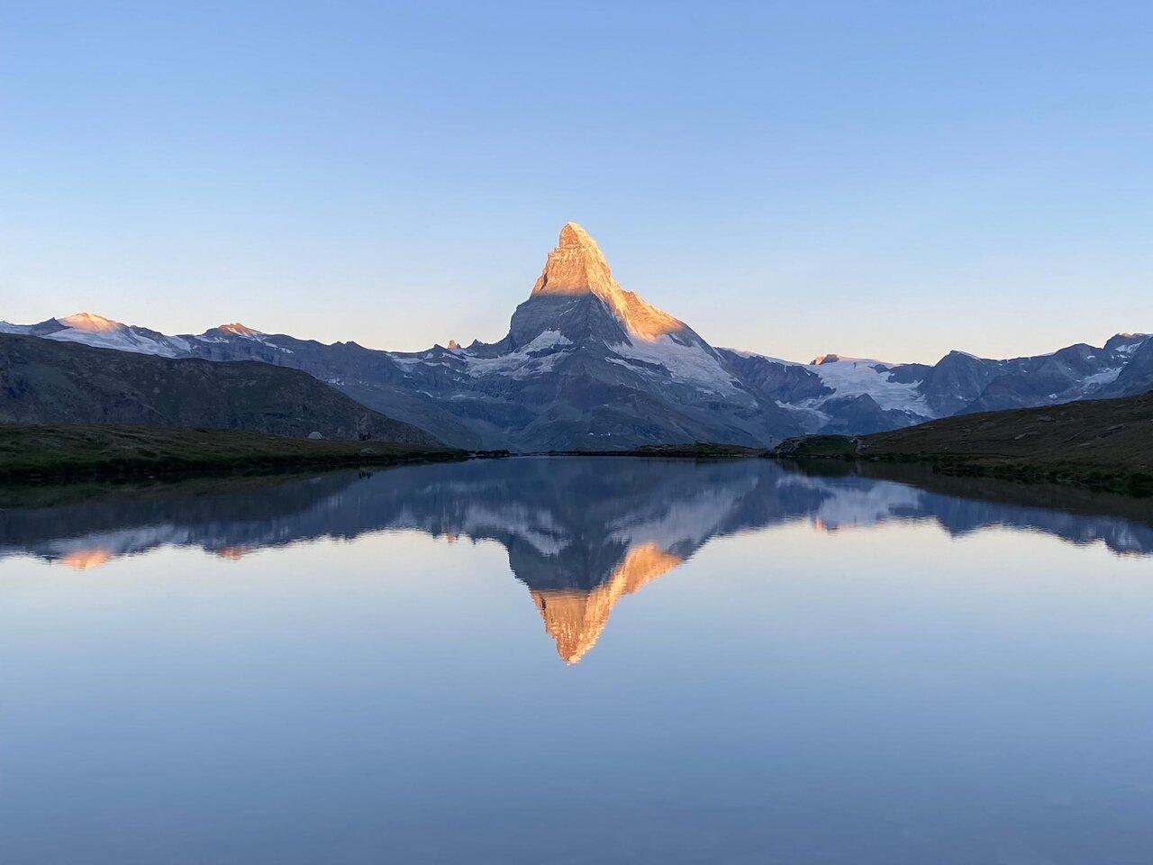 Erlebe, wie die ersten Sonnenstrahlen langsam die imposanten Berggipfel rötlich färben. Wie das Matterhorn sich nach der Sonne streckt. Und wie friedlich und ruhig die Alpweiden dazwischen liegen. Das Schauspiel wird am Stellisee genossen, wo sich an windstillen Tagen das Matterhorn spiegelt.