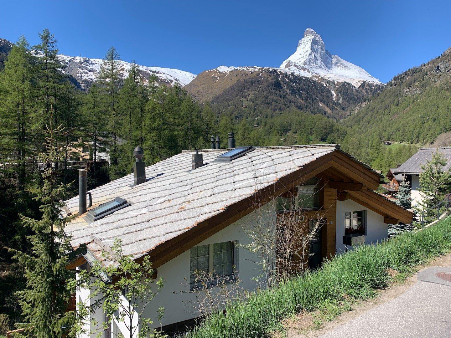 Die Wohnung verfügt über eine grosszügige, nach Süden gerichtete Fensterfront mit einem über die gesamte Länge reichenden Balkon. Dieser eröffnet einen atemberaubenden Blick zum Matterhorn hin, davor liegt tief unten der Findelbach inmitten eines beruhigenden Lärchenwaldes. Durch die bevorzugte Hanglage befindet sich der Eingang zum Haus im 3. Stock und damit ebenerdig zu dieser einzigartigen Dachwohnung.