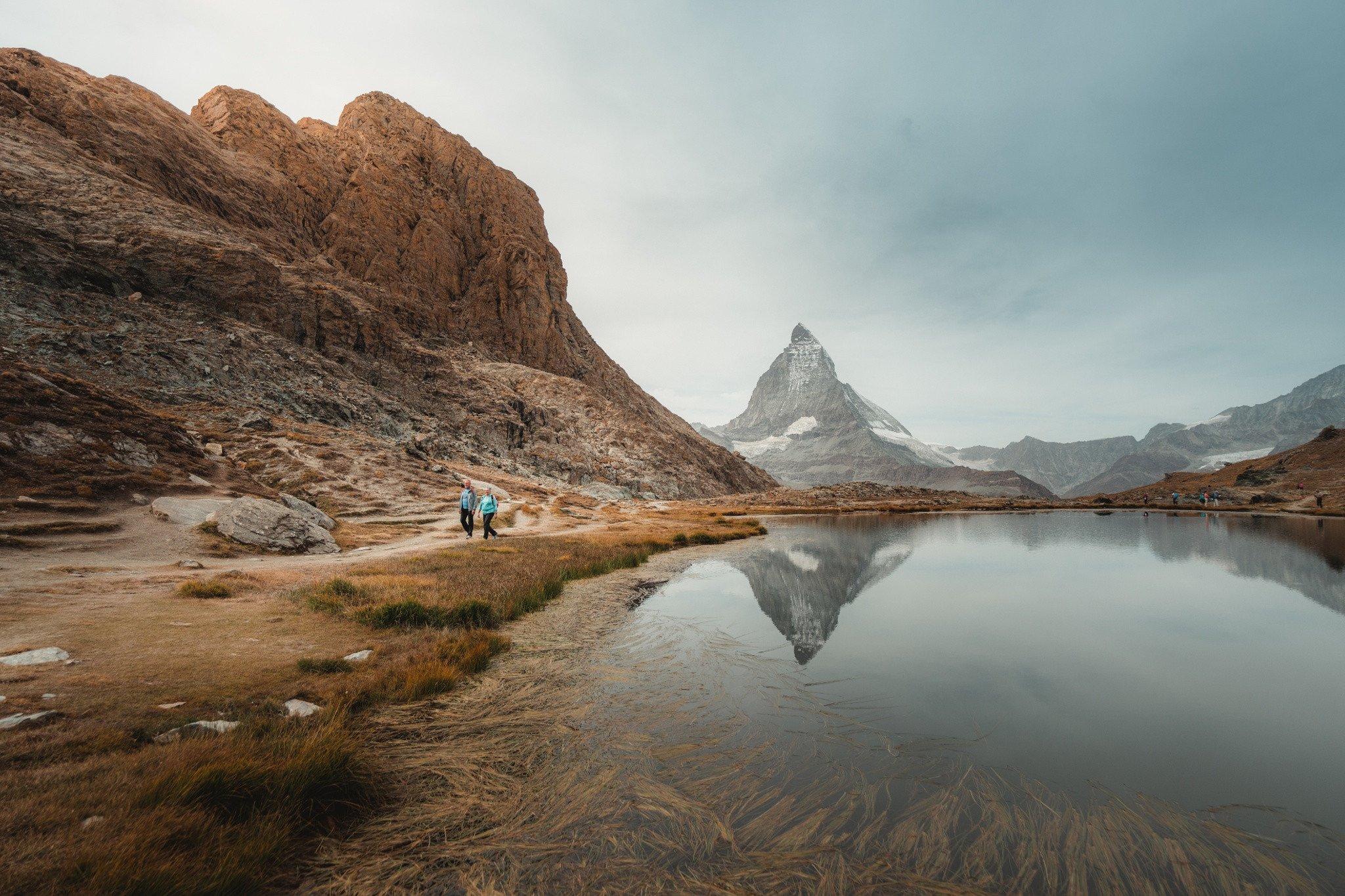 Hier geht's zum Fotopunkt der Sonderklasse. Im Riffelsee spiegelt sich das Matterhorn. Mit urtümlicher Landschaft darum herum und kleinem Fels im Seelein. Idylle pur.