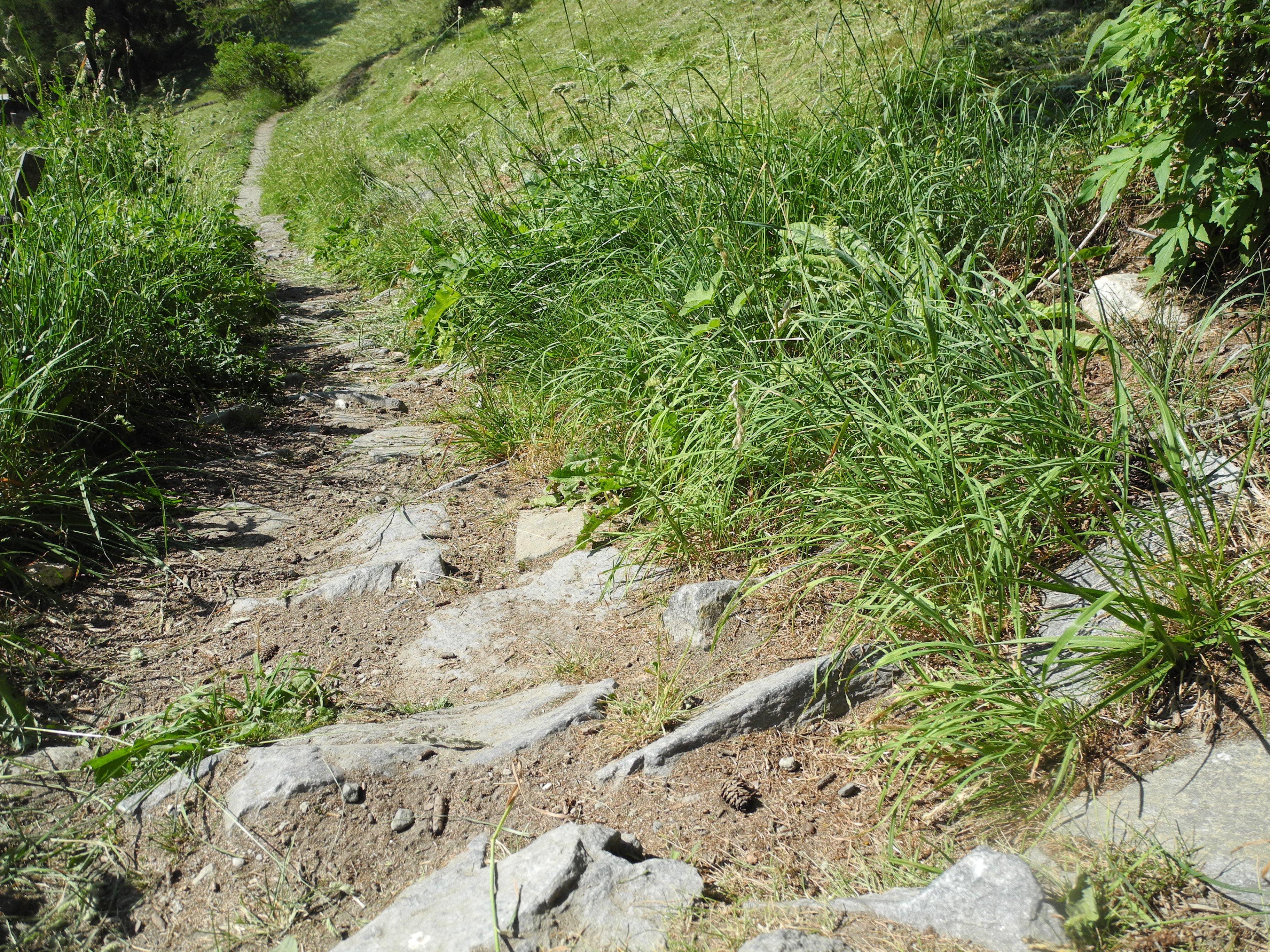 Die teils stehend in den Boden eingelassenen Steine schützen den Weg bei Regen und Viehgang vor Abnutzung und Abrutschen. Solche Steinwege heissen im Zermatter Dialekt „en Bikki“, der Weg ist „gibikkinutta“.